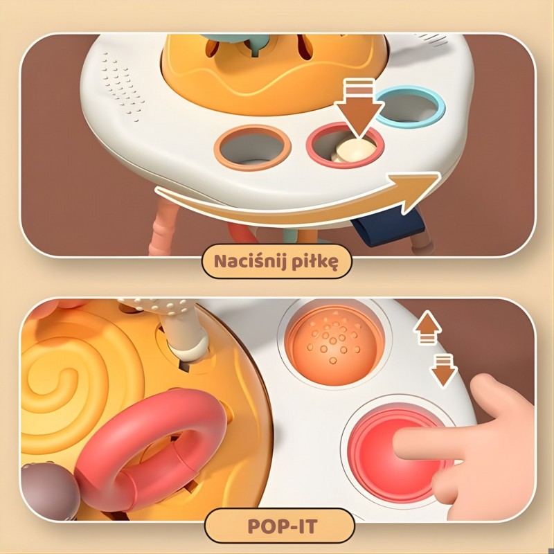 Zabawka Sensoryczna Montessori Gryzak "Przeciąganka" w kształcie UFO od marki WOOPIE to nie tylko doskonała rozrywka, ale i innowacyjny sposób na wspieranie rozwoju Twojego niemowlaka. Zachęca do odkrywania przez zmysły, skupia na rozwoju koordynacji i motoryki oraz łagodzi dyskomfort związany z ząbkowaniem. Zestaw zawiera kolorowe, bezpieczne i łatwe do uchwycenia przez małe rączki sznurki z różnorodnymi teksturami, które pobudzają do działania i eksploracji, jednocześnie oferując ulgę podczas ząbkowania. Pociąganie za sznurek wydaje różnorodne dźwięki i wibracje. Ponadto zabawka jest wyposażona w rząd miękkich przycisków, które zachęcają do dotyku i przyciskania. Podwyższona pozycja pobudza ciekawość dziecka i ćwiczy zręczność małych paluszków Ten sensoryczny gryzak to idealny prezent dla niemowlaka, który łączy rozrywkę z nauką. Dzięki niemu możesz zapewnić Twojemu dziecku zdrowy rozwój i godziny angażującej zabawy. Zapewnij komfort i rozwój swojemu maluchowi!