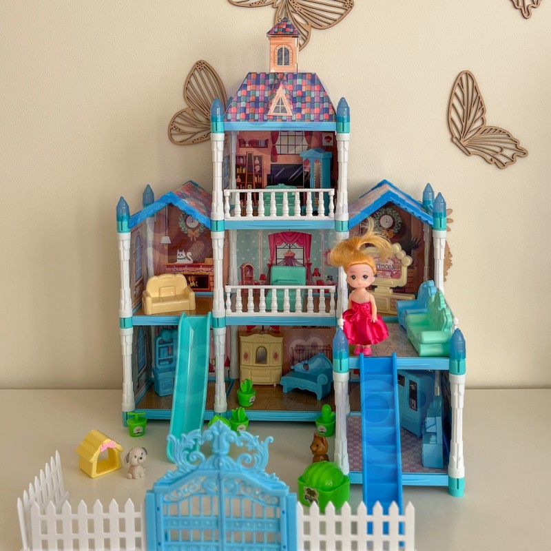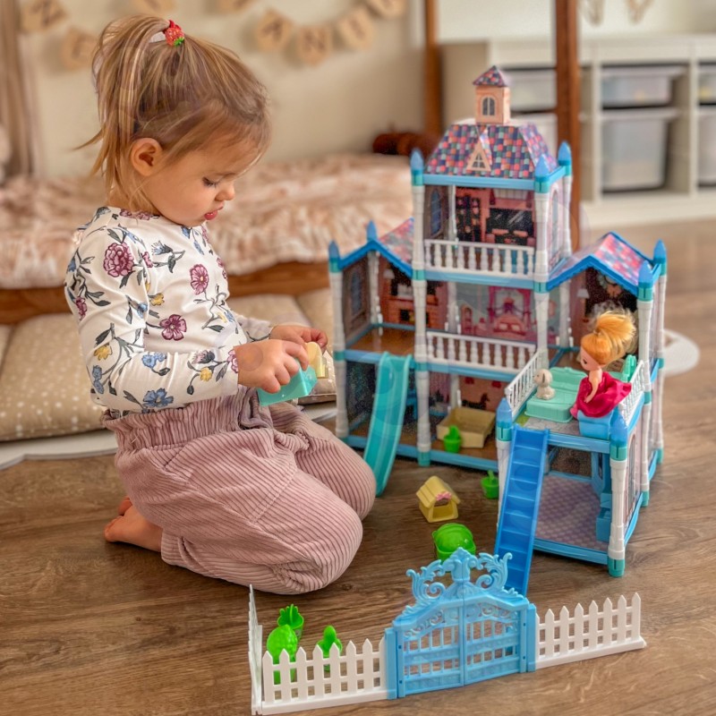 Odkryj magiczny świat zabawy z zestawem Domkiem dla Lalek od marki Woopie! Ten ogromny, trzypiętrowy pałac oferuje niezliczone możliwości kreatywnej zabawy. Zestaw zawiera aż 191 elementów, w tym uroczą lalkę, dwa zwierzątka , bogate wyposażenie wnętrz oraz piękne, świecące fotoluminescencyjne dekoracje , które sprawią, że zabawa nie skończy się po zmroku. Domek utrzymany jest w uroczej, niebiesko-różowej kolorystyce, inspirowanej zimowym ogrodem. Idealny na prezent, zachęca do odgrywania ról, rozwijając wyobraźnię i umiejętności społeczne.