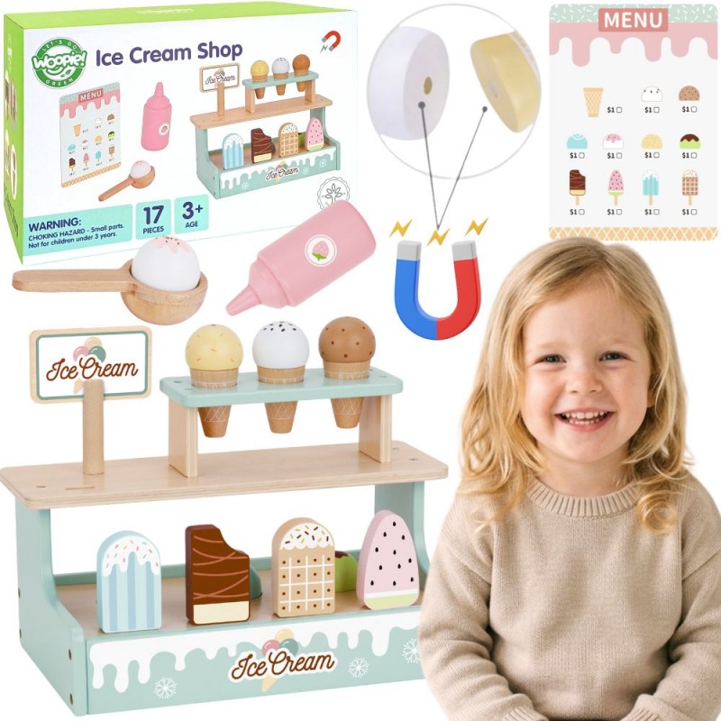 Zostań lodowym mistrzem z uroczym straganem Woopie Green! Ten pastelowy zestaw to wymarzona zabawka dla małych kucharzy i cukierników. Dzieci mogą bawić się w sklepik, serwując pyszne lody z wafelkiem, gałkami i lodami na patyku – wszystko wykonane z bezpiecznego drewna i pięknie pomalowane. Dzięki magnetycznym gałkom i dołączonemu menu maluch może wcielić się w rolę lodziarza i rozwijać wyobraźnię oraz zdolności manualne podczas zabawy.