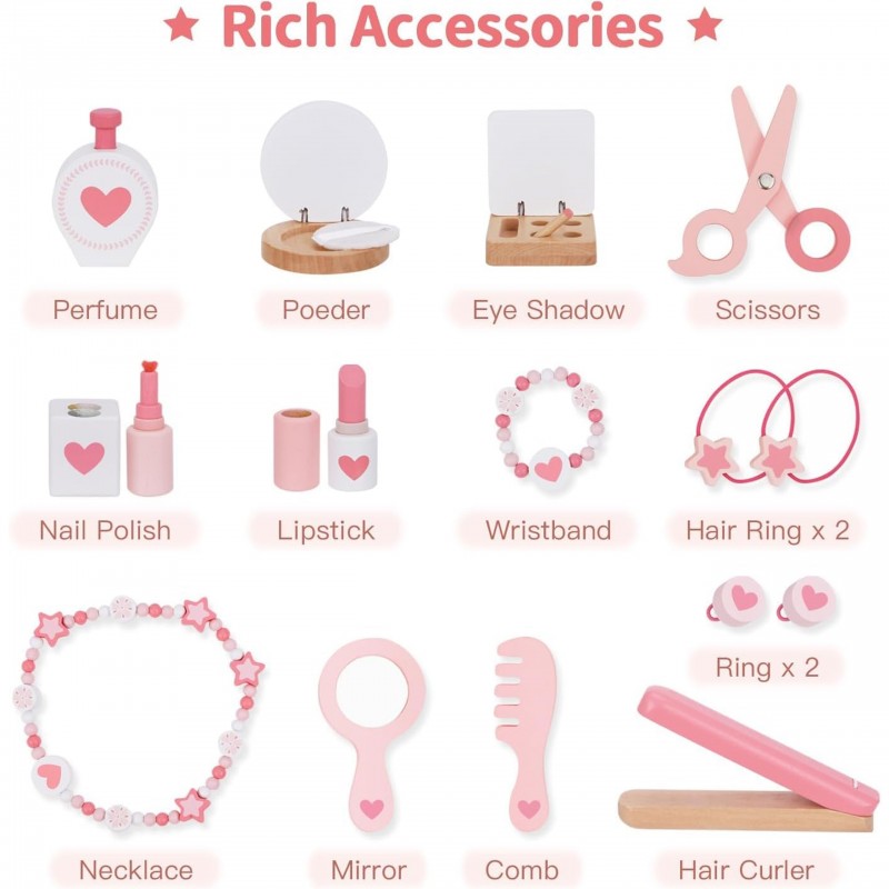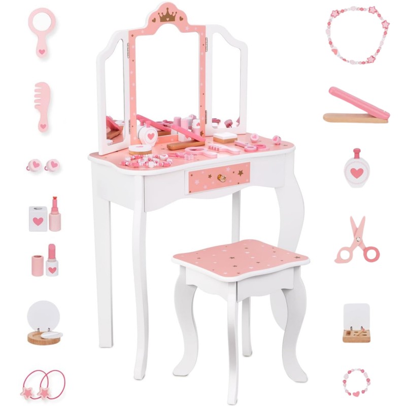 Drewniana toaletka z akcesoriami dla dzieci od Woopie Green to niezwykle urocza i dopracowana w każdym szczególe zabawka, która przenosi dzieci w świat wyobraźni, piękna i kreatywnej zabawy. Zaprojektowana z myślą o najmłodszych miłośniczkach stylu i estetyki, stanowi nie tylko piękny mebel do pokoju, ale również narzędzie wspierające rozwój emocjonalny, społeczny i manualny dziecka. Toaletka zachwyca eleganckim designem inspirowanym klasycznymi meblami dorosłych – ma kształt delikatnego biureczka z potrójnym lustrem, szufladką na drobiazgi i wygodnym stołeczkiem dopasowanym do wzrostu dziecka. Całość wykonana jest z wysokiej jakości drewna, pomalowanego bezpiecznymi, nietoksycznymi farbami w pastelowych odcieniach różu, bieli i złota. Każdy element został starannie oszlifowany, aby zapewnić bezpieczeństwo podczas zabawy. Zdobienia w postaci korony, serduszek i gwiazdek nadają toaletce bajkowego charakteru, sprawiając, że dziecko może poczuć się jak prawdziwa księżniczka lub artystka przygotowująca się do występu. Jej stylowy wygląd doskonale komponuje się z wystrojem dziecięcego pokoju – stanowi zarówno zabawkę, jak i elegancki element dekoracyjny. Toaletka wyposażona jest w praktyczną szufladkę, w której dziecko może przechowywać swoje skarby, biżuterię, akcesoria do włosów i kosmetyki do zabawy. Trzyczęściowe lustro z ruchomymi skrzydłami umożliwia przeglądanie się z różnych stron, a szeroki blat zapewnia dużo miejsca na wszystkie niezbędne dodatki. W zestawie znajduje się również bogaty komplet akcesoriów, dzięki którym zabawa staje się jeszcze bardziej realistyczna – wśród nich lusterko, grzebień, suszarka, cienie, lakier, pomadka, puder czy nawet drewniane perfumy. Dziecko może tworzyć własne stylizacje, ucząc się przy tym dokładności, cierpliwości i samodzielności.