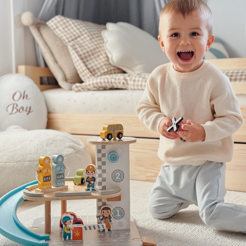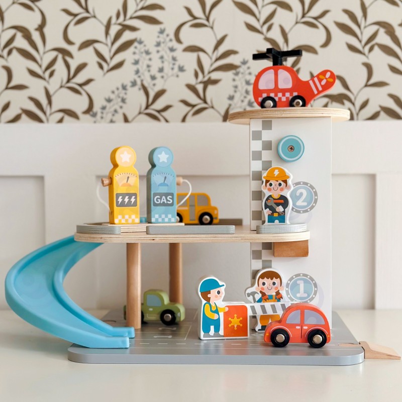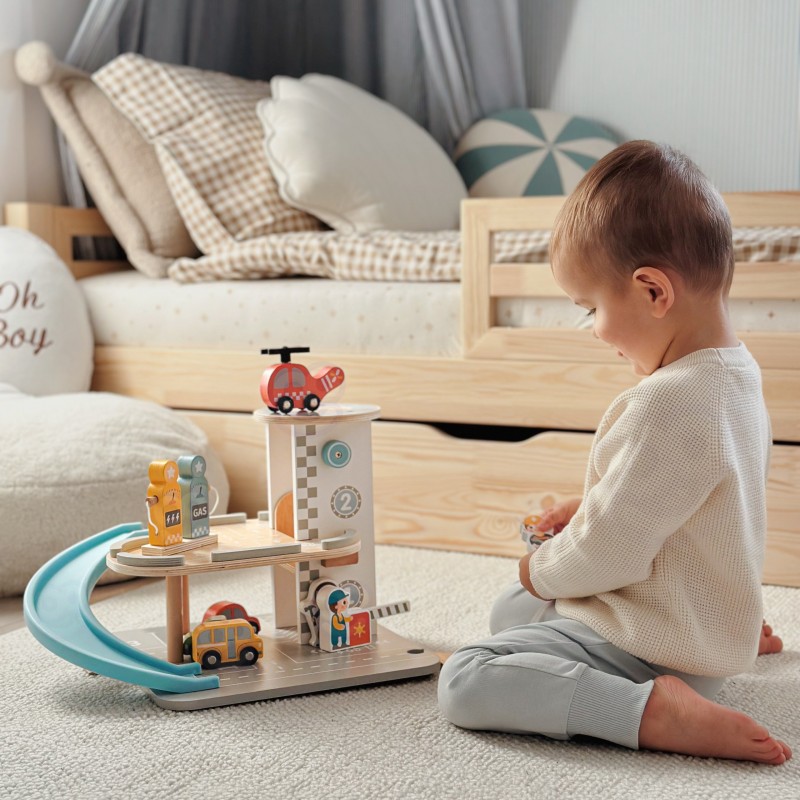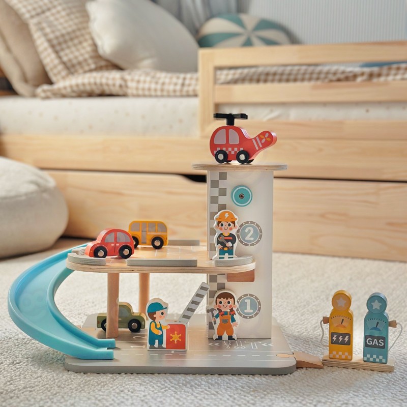 Wielopoziomowy drewniany parking marki Woopie Green to marzenie każdego małego miłośnika samochodów. Ta wyjątkowa zabawka oferuje mnóstwo możliwości kreatywnej zabawy. Kolorowe drewniane samochody zjeżdżają po niebieskiej zjeżdżalni, helikopter z obrotowym śmigłem ląduje na szczycie wieży, a figurki pracowników dbają o porządek i obsługują stację benzynową. Solidna drewniana konstrukcja w subtelnych, pastelowych kolorach świetnie wygląda w pokoju dziecka