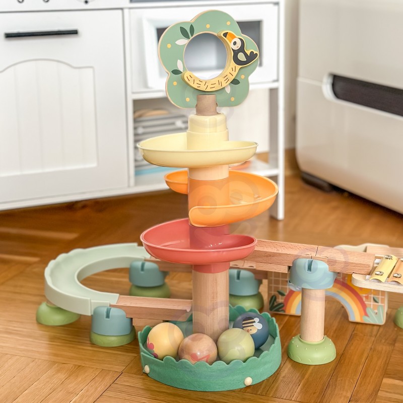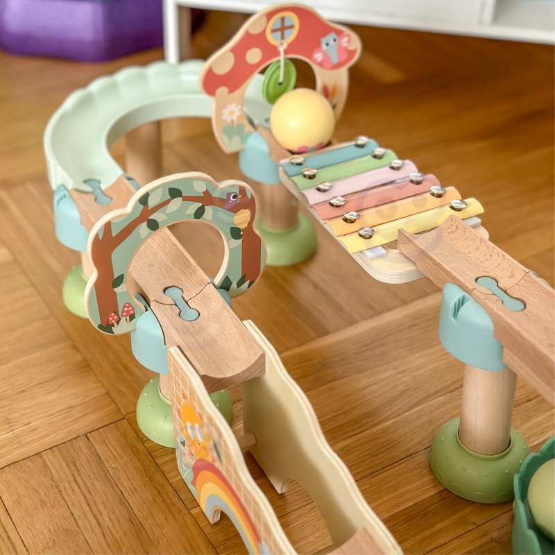 Przepiękny drewniany tor kulkowy od Woopie Green to wyjątkowa zabawka, która łączy w sobie elementy ruchu, dźwięku i nauki poprzez zabawę. To idealny zestaw dla najmłodszych odkrywców świata, którzy z radością obserwują, jak kolorowe kulki toczą się po torze, wprawiając w ruch różne elementy i wydając przyjemne dźwięki. Całość utrzymana jest w pastelowej, przyjaznej kolorystyce, która przyciąga wzrok i wprowadza do zabawy ciepłą, spokojną atmosferę. Zabawka zachwyca nie tylko wyglądem, ale przede wszystkim funkcjonalnością i jakością wykonania – została zaprojektowana z myślą o rozwoju dziecka już od najmłodszych lat. Dzięki różnorodnym elementom – takim jak spiralne zjeżdżalnie, mostki, tory oraz cymbałki – dziecko może obserwować zmieniające się ruchy piłeczek, słuchać wydawanych przez nie dźwięków oraz eksperymentować z prędkością i kierunkiem ich toczenia. To doskonała forma zabawy, która jednocześnie rozwija i bawi. Zabawka sprawdzi się w domu, przedszkolu lub jako efektowny prezent dla dziecka w wieku niemowlęcym i wczesnodziecięcym.