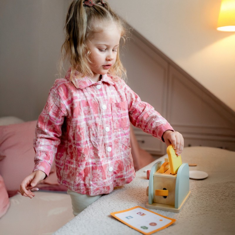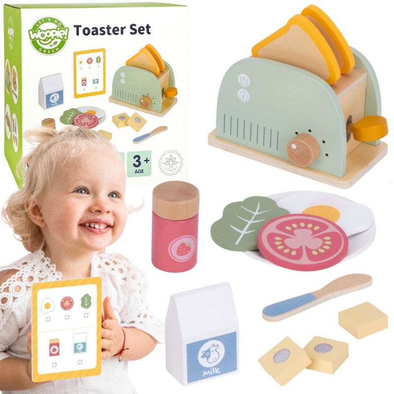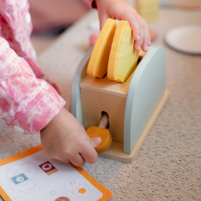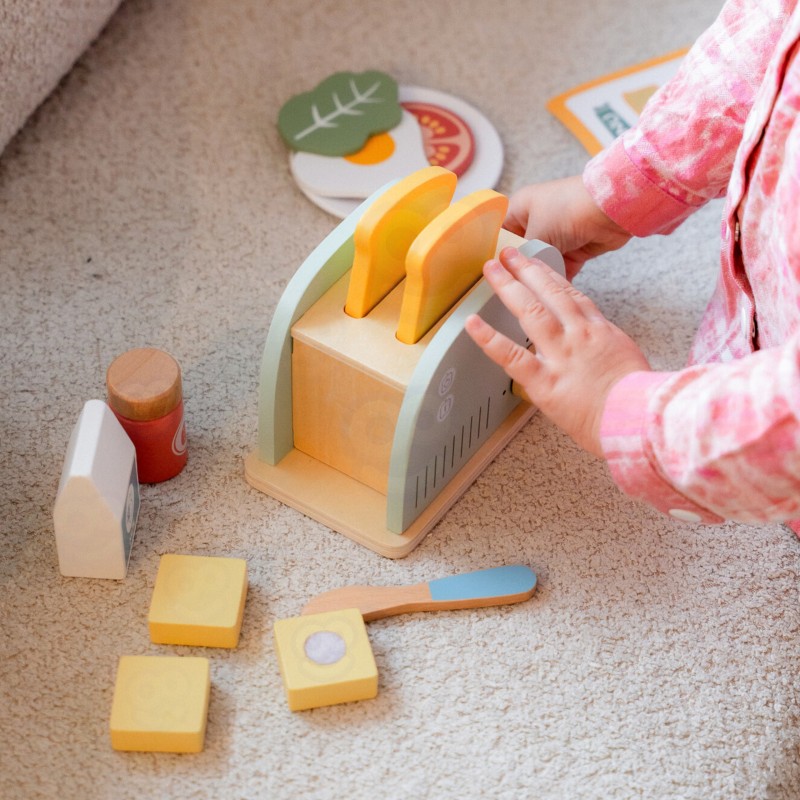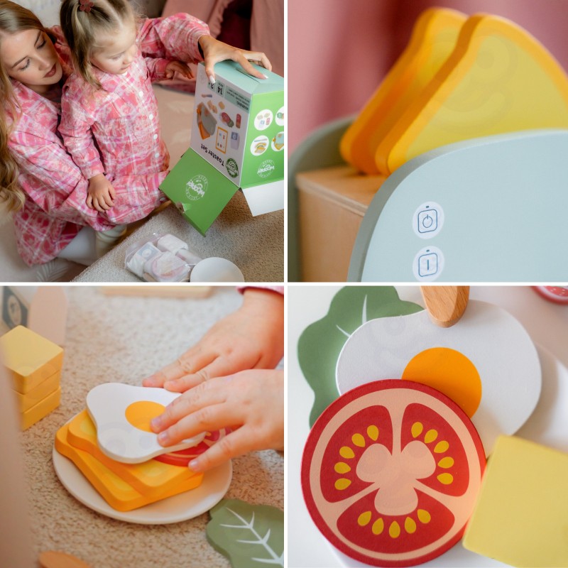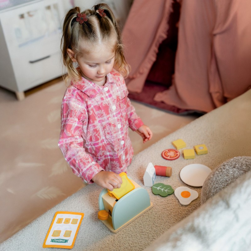 Drewniany zestaw śniadaniowy z tosterem to doskonała propozycja dla dzieci, które uwielbiają zabawę w dom, gotowanie i naśladowanie dorosłych. Zestaw inspirowany jest codziennymi czynnościami w kuchni – pozwala przygotować pyszne tosty, jajko sadzone czy kanapkę z dodatkami. Dzięki zabawce dziecko może wcielić się w rolę małego kucharza i w kreatywny sposób rozwijać swoje umiejętności społeczne oraz wyobraźnię. Całość wykonana jest z bezpiecznego, gładko wykończonego drewna i pomalowana nietoksycznymi farbami w pastelowych barwach. Zabawka jest nie tylko piękna, ale także solidna i trwała. Zestaw idealnie sprawdzi się zarówno do samodzielnej zabawy, jak i wspólnego gotowania z rodzicem lub rodzeństwem. To doskonały pomysł na prezent, który uczy poprzez zabawę i rozwija codzienne umiejętności dziecka.