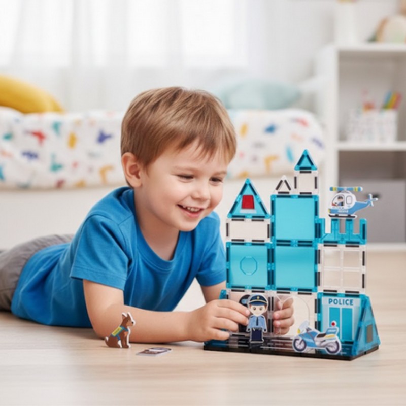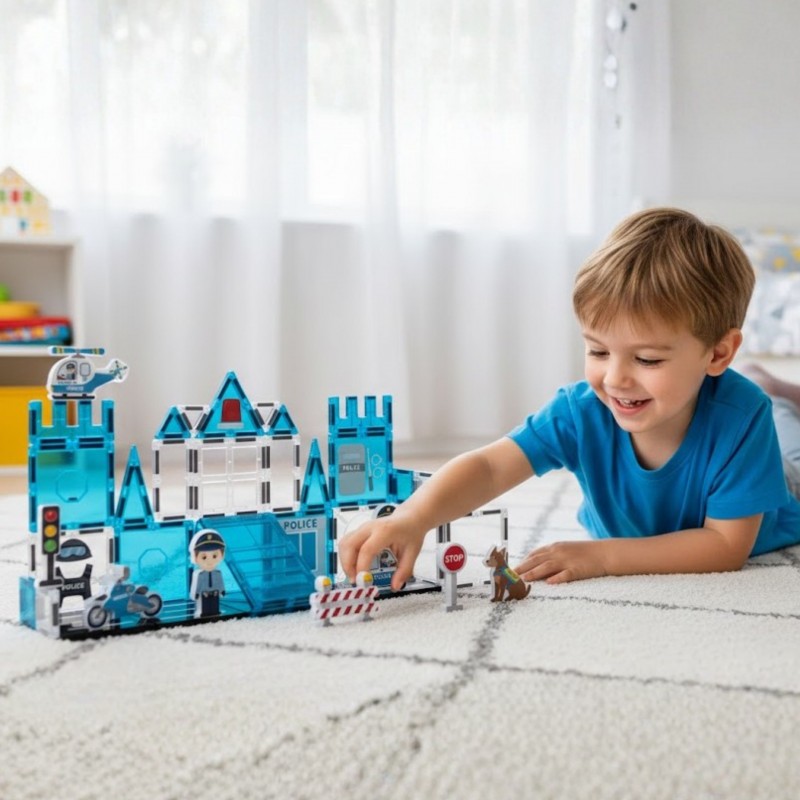 Klocki magnetyczne Komisariat Policja od marki Woopie! to kreatywna zabawka, która pozwala dzieciom zbudować swój własny posterunek policji z magnetycznych paneli i akcesoriów. Dzięki silnym magnesom elementy łączą się pewnie, umożliwiając stabilne konstrukcje. Akcesoria policyjne jak radiowóz, helikopter, figurki funkcjonariuszy, pies policyjny i znaki drogowe uatrakcyjniają zabawę. Zestaw pozwala maluchom rozwijać kreatywność, umiejętność logicznego myślenia i planowania. Wykonany z bezpiecznych materiałów, stanowi świetny pomysł na prezent dla małych fanów policyjnych przygód.