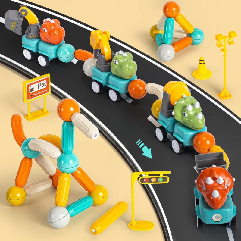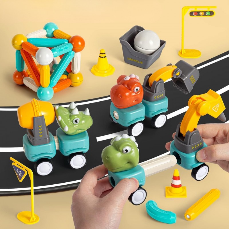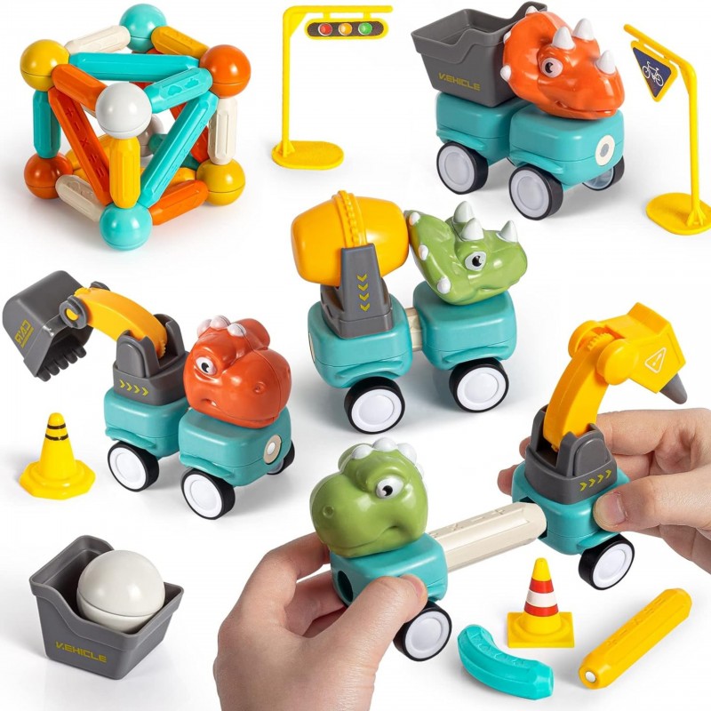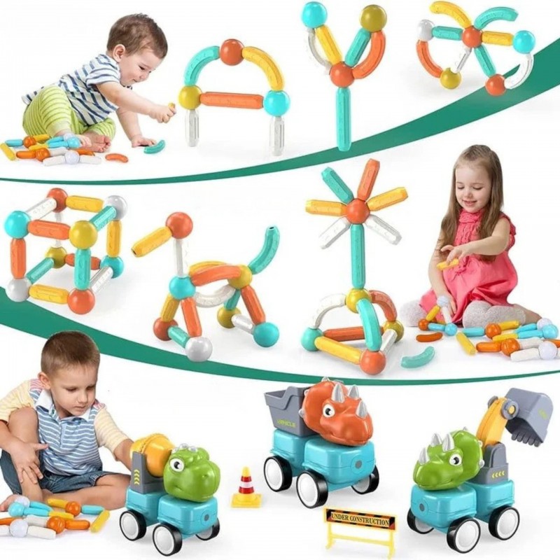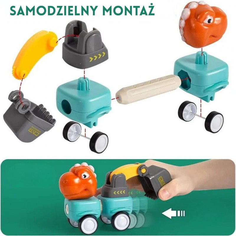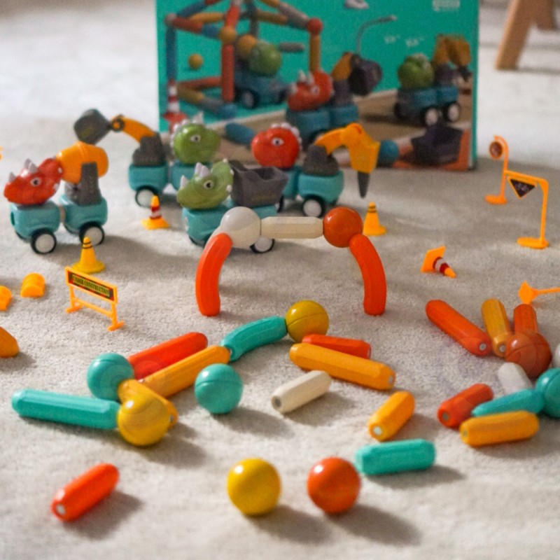 Zestaw magnetycznych klocków konstrukcyjnych z motywem dinozaurów i pojazdów budowlanych od Woopie to doskonała propozycja dla małych inżynierów. Składający się z 58 elementów komplet pozwala na tworzenie różnorodnych maszyn, takich jak koparka, betoniarka, wywrotka czy dźwig. Dzięki innowacyjnemu systemowi łączenia za pomocą magnetycznych pałeczek i kulek, budowanie jest proste i daje nieograniczone możliwości konstrukcyjne. Zabawka wyróżnia się ruchomymi, obracającymi się częściami maszyn oraz wygodnym napędem kół typu popchnij i jedź. Całość została wykonana z bezpiecznych, nietoksycznych materiałów, gwarantując beztroską edukacyjną zabawę. Elementy zestawu posiadają wbudowane magnesy, które w prosty sposób pozwalają ze sobą łączyć elementy konstrukcyjne, zatem dzieci z pewnością poradzą sobie z jego ułożeniem. Intensywne kolory i duże rozmiary zestawu wzbogacą udaną zabawę w nowe doświadczenia.