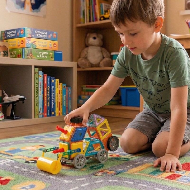 Odkryj świat kreatywnej zabawy z innowacyjnym zestawem klocków magnetycznych 3D od marki Woopie! Ten 80-elementowy zestaw to fantastyczny sposób na rozwijanie wyobraźni i umiejętności inżynierskich u Twojego dziecka. Klocki magnetyczne pozwalają na tworzenie trójwymiarowych konstrukcji, w tym realistycznych pojazdów budowlanych, takich jak wywrotka, spychacz/ładowarka, a także robotów. Żywe kolory i różnorodne kształty geometryczne (kwadraty, trójkąty, trapezy) w połączeniu z elementami pojazdów (koła, podwozia, elementy łyżki/wywrotki) zapewniają nieograniczone możliwości budowania i przekształcania. Magnetyczne łączenia sprawiają, że konstrukcje są stabilne i łatwe w montażu, co jest idealne dla małych rączek. To edukacyjna zabawka STEM (Science, Technology, Engineering, Mathematics), która inspiruje do nauki poprzez zabawę. Zabawa klockami magnetycznymi wspiera rozwój zdolności motorycznych i uczy podstaw geometrii oraz fizyki, prezentując zjawisko magnetyzmu w praktyczny sposób. Duża liczba elementów, w tym specjalne części do budowy pojazdów i maszyn, gwarantuje godziny fascynującej, rozwijającej rozrywki. Postaw na jakość i innowacyjność, wybierając zestaw klocków magnetycznych 3D od marki Woopie!