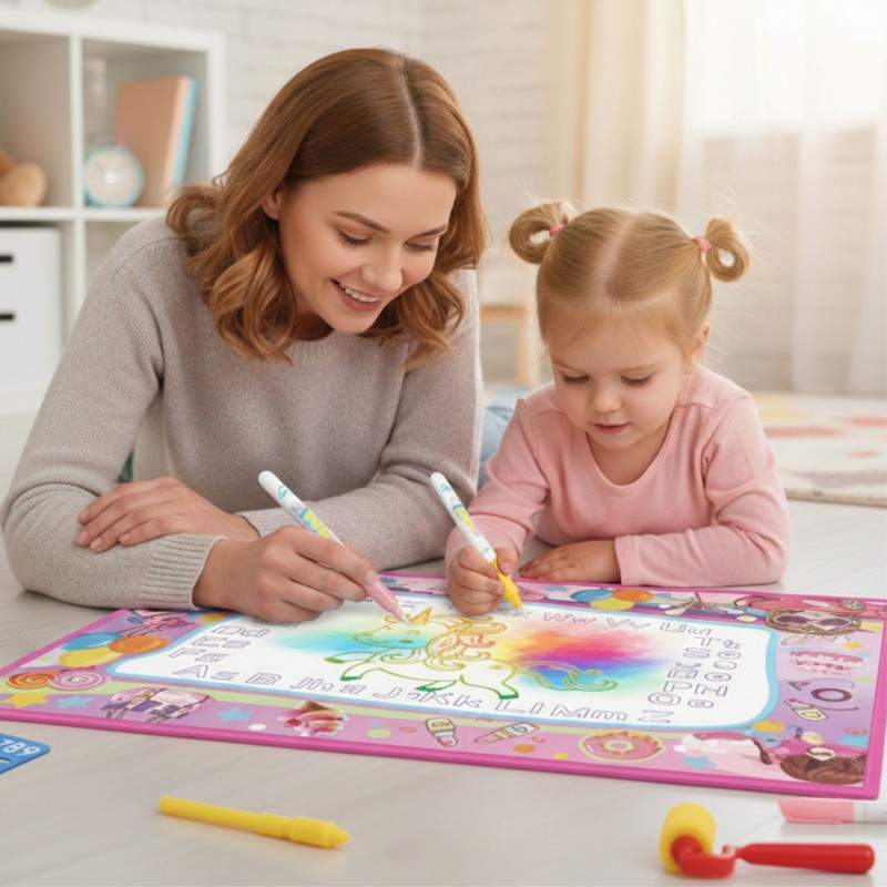 Rozpal wyobraźnię dziecka dzięki wielofunkcyjnej Macie Wodnej 2w1 marki Woopie! Ta wyjątkowa mata do rysowania łączy w sobie funkcje malowanie wodą oraz rysowanie światłem UV. Po kilku minutach rysunki stopniowo znikają, dając dziecku możliwość tworzenia nowych dzieł bez końca. Bajkowy dziewczęcy motyw pełny balonów, jednorożców, zamków i gwiazd przeniesie dziecko w magiczny świat kreatywnej zabawy. Wystarczy trochę wody by stworzyć kolorowe arcydzieła – bez tuszu, bez brudu, bez ryzyka zniszczeń. Idealna do zabawy solo lub z rodzeństwem, przyjaciółmi czy rodzicami. Mata poprawia zdolności manualne, koordynację ręka-oko i jest świetnym sposobem na naukę przez zabawę. Można z niej korzystać zarówno w domu jak i w ogrodzie.