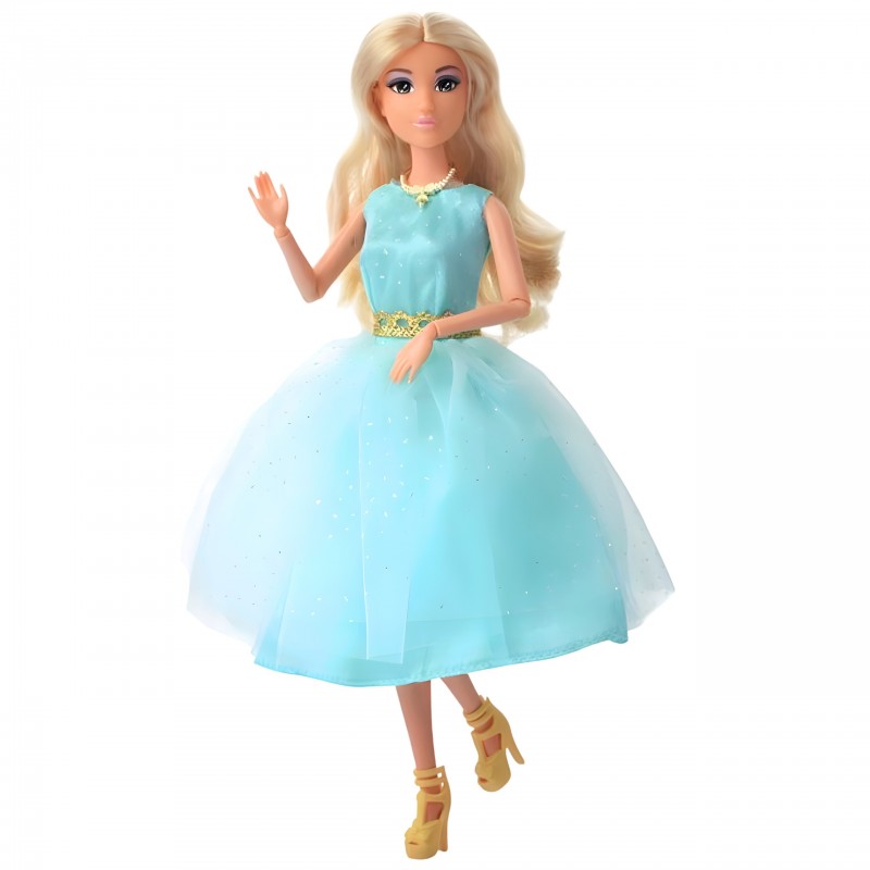 Poznaj przepiękną lalkę Lily marki Woopie Royal, która zachwyca ponadczasowym stylem i wyjątkową elegancją. Ta urocza blondynka o długich, lśniących włosach ubrana jest w bajkową sukienkę balową w odcieniu turkusu, która mieni się delikatnymi błyskami. Tiulowa spódnica nadaje kreacji lekkości i uroku, eleganckie dodatki – naszyjnik i kolczyki – podkreślają jej charakter. Dopełnieniem stylizacji są eleganckie złote szpilki, które sprawiają, że lalka wygląda jak prawdziwa gwiazda balu. To idealna towarzyszka zabawy dla każdej małej marzycielki, która uwielbia świat mody, elegancji i bajkowych