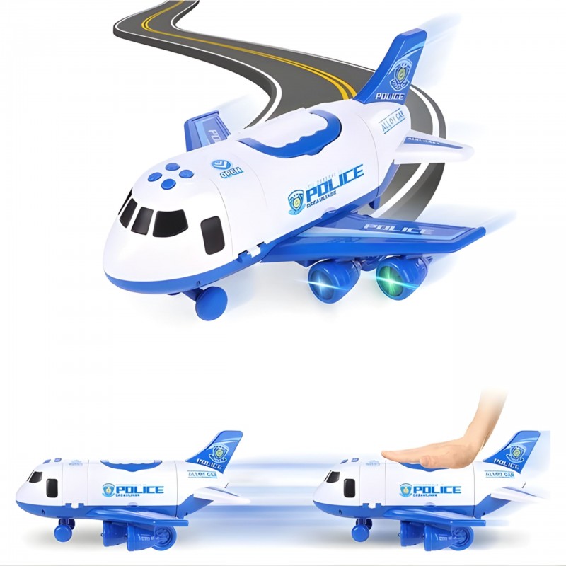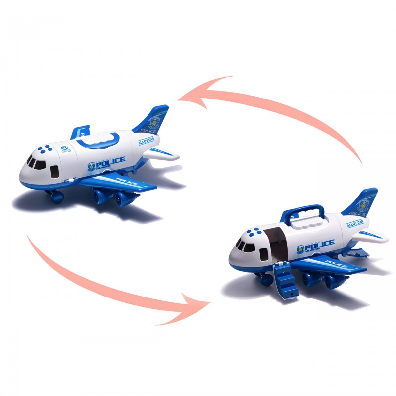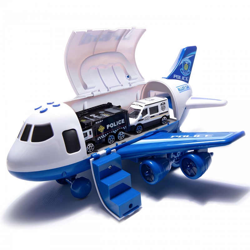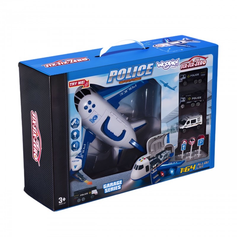 Poznaj DUŻY otwierany samolot-transporter policyjny od marki WOOPIE! który zabierze dziecko w ekscytującą misję stróżów prawa! W przestronnym kadłubie samolotu zmieszczą się trzy policyjne auta oraz komplet znaków drogowych, co zapewnia dynamiczną zabawę. Dzięki czterem przyciskom zabawka wydaje realistyczne syreny policyjne, a migające diody LED dodają akcji dynamiki. Rampa samolotu opada, a uchwyt ułatwia przenoszenie, co sprawia, że to zabawka mobilna i praktyczna. To wymarzony prezent dla małego policjanta od 3. roku życia, który rozwija wyobraźnię i uczy pracy zespołowej.