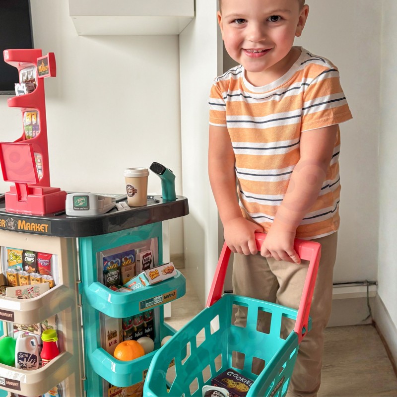 Dzieci naśladują dorosłych robiących zakupy. Zabawka jest bardzo realistyczna jest nawet czytnik kart kredytowych. Pojemne szafki na produkty. Artykuły spożywce doskonale odwzorowane.