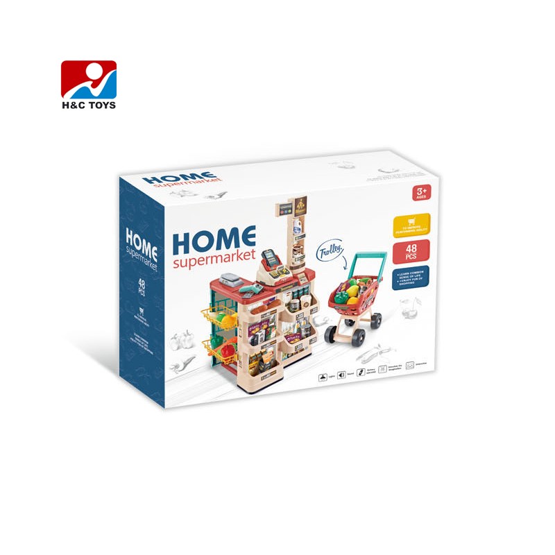 Bogato wyposażony supermarket z wózkiem sklepowym i mnóstwem akcesoriów to idealny zestaw dla każdego małego sprzedawcy. Dzieci uwielbiają naśladować dorosłych w ich codziennych obowiązkach, a ten komplet pozwala na realistyczną i pasjonującą zabawę w sklep, nieważne gdzie i kiedy. Stanowisko pracy zostało zaopatrzone we wszystkie niezbędne elementy, które można spotkać w prawdziwym markecie. Duże stoisko posiada specjalne półki na produkty wraz z oznaczonymi cenami, kasę z otwieraną na guzik szufladą oraz precyzyjnie odwzorowaną wagę. Największą atrakcją zestawu jest świecący skaner wydający dźwięki, który sprawia, że nabijanie produktów na kasę staje się niezwykle emocjonujące. Komplet charakteryzuje się uniwersalnym, estetycznym wyglądem, który doskonale wkomponuje się w wystrój każdego pokoju dziecięcego.