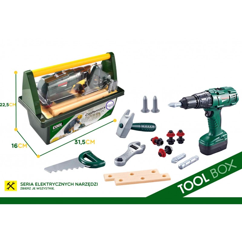 Świetny zestaw dla małego majsterkowicza, synek naśladuje swojego tatę przy pracy. Wiertarka bardzo przypomina prawdziwą. Skrzynka na narzędzia jest bardzo poręczna.