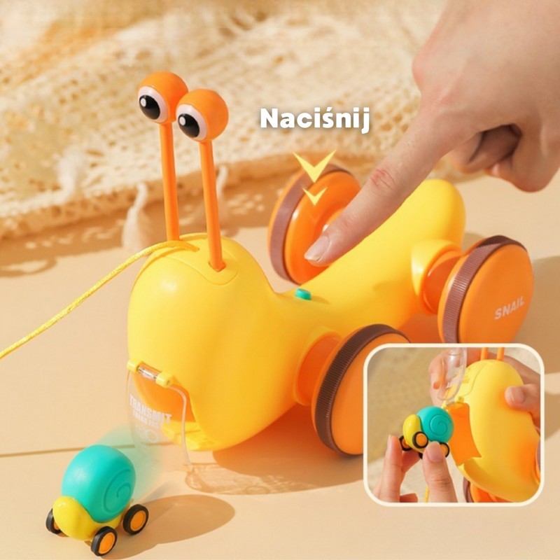 Wielofunkcyjna zabawka do pchania ślimaka od marki WOOPIE która przyciąga uwagę dzieci i stymuluje ich wyobraźnię. Jasne kolory poprawiają także ich percepcję wzrokową i zmysł estetyczny. Zabawka do ciągnięcia ślimaka zapewnia różne sposoby zabawy i nauki. Możesz uderzać w klawisze aby ćwiczyć słuch dzieci i koordynację wzrokowo-ruchową. Możesz także ciągnąć ślimaka na smyczy lub popchnąć go i pozwolić mu ślizgać się po podłodze, co zwiększa zabawę i wyzwanie.Podczas zabawy dzieci poznają zwierzęta, muzykę oraz związki przyczynowo-skutkowe. Zachęcaj do obserwacji, umiejętności logicznego myślenia i koordynacji fizycznej, podczas gdy dziecko będzie mogło cieszyć się godzinami kreatywnej zabawy. Zabawka do ciągnięcia ślimaka to świetny sposób na dzielenie się szczęśliwym czasem z dziećmi. Mamy mogą bawić się ze swoimi pociechami i patrzeć, jak chichoczą, gdy ślimak się porusza. Ta zabawka nadaje się do interakcji rodzinnych i może wzmacniać wzajemne uczucia. Zabawka składa się z dwóch części: muszli ślimaka- która zawiera cymbałki, oraz pałeczki do nich w kształcie oczu ( umieszczone są w środku muszli). Druga część to wyrzutnia małego autka z ciała ślimaka- na grzbiecie zabawki umieszczony jest przycisk, który otwiera wyrzutnię dla autka.
