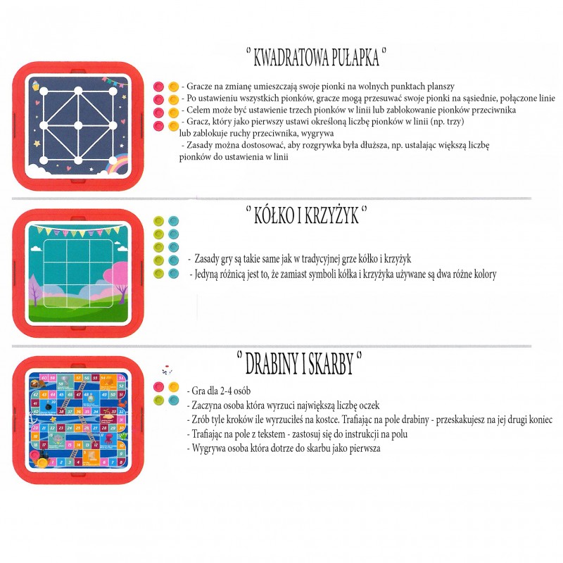 Stolik Gier Planszowych 11w1 od marki WOOPIE to niezwykle wszechstronny zestaw edukacyjny, który łączy fantastyczną zabawę z intensywnym rozwojem logicznego myślenia. Ten kompaktowy stolik to tak naprawdę 11 różnych mini gier i łamigłówek, zapewniając różnorodny wachlarz wyzwań dla całej rodziny. Zestaw zawiera zarówno klasyczne planszówki (jak Chińczyk, Warcaby, Kółko i krzyżyk), jak i gry logiczne, przestrzenne oraz zadania z dopasowaniem wzorów. Wygodna konstrukcja w formie stolika jest idealna do gry na siedząco, a łatwość przechowywania i przenoszenia sprawia, że jest to doskonała propozycja na domowe wieczory, a także na podróż.