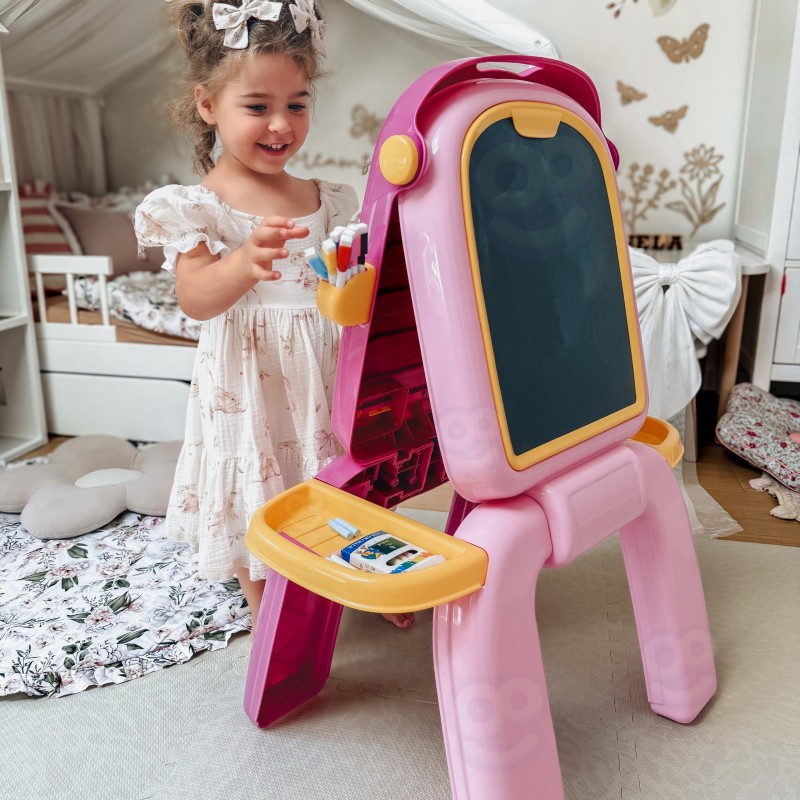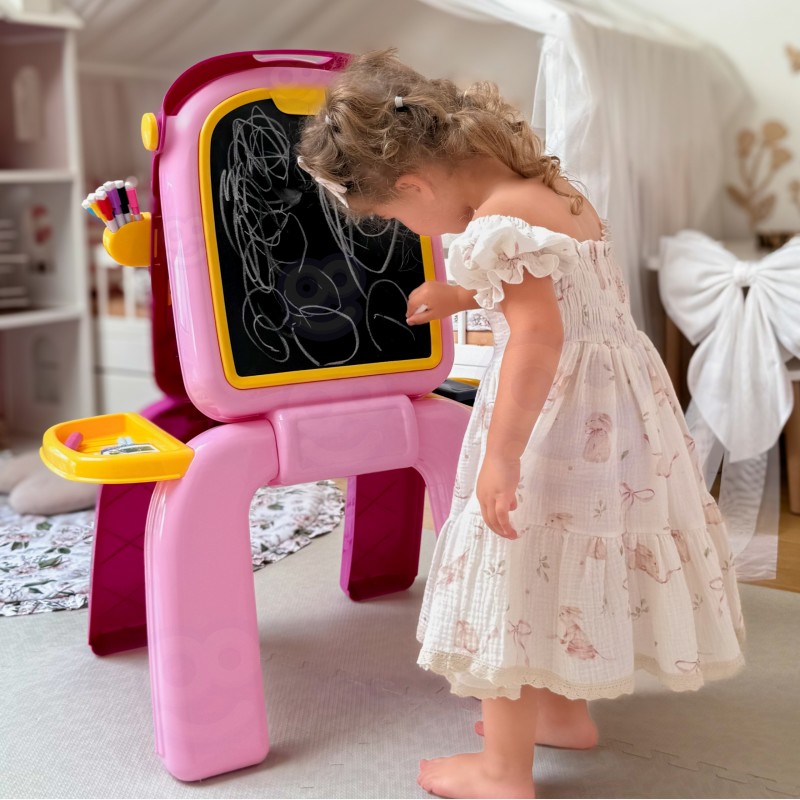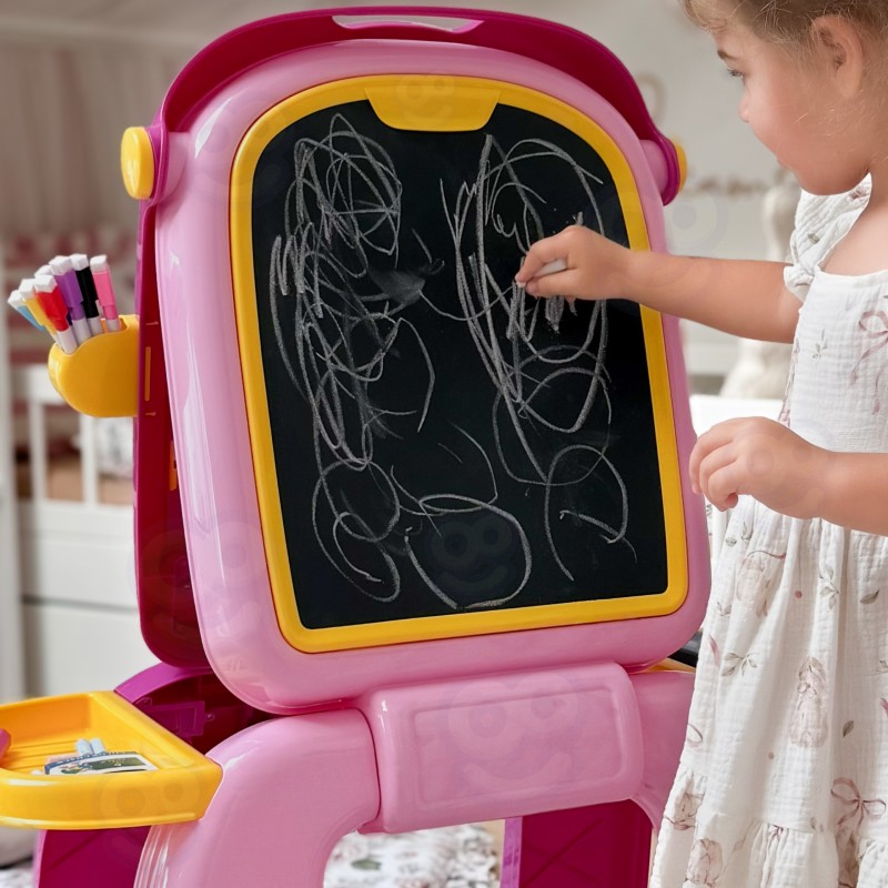 Ta wyjątkowa, kolorowa tablica 2w1 to świetne rozwiązanie dla każdego małego artysty, odkrywcy i ucznia. Dzięki niej Twoje dziecko będzie mogło rysować, pisać, poznawać literki i liczby, uczyć się kolorów, rozwijać zdolności manualne i spędzać czas w kreatywny sposób – bez wpatrywania się w ekran! Zabawa przy tablicy to nie tylko świetna rozrywka – to także wsparcie dla rozwoju wyobraźni, koncentracji i precyzji ruchów. Dwustronna powierzchnia (biała i czarna) oraz bogaty zestaw akcesoriów (pisaki, kredki, magnesy) sprawiają, że możliwości są niemal nieograniczone.