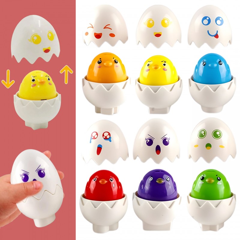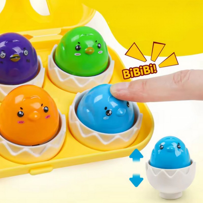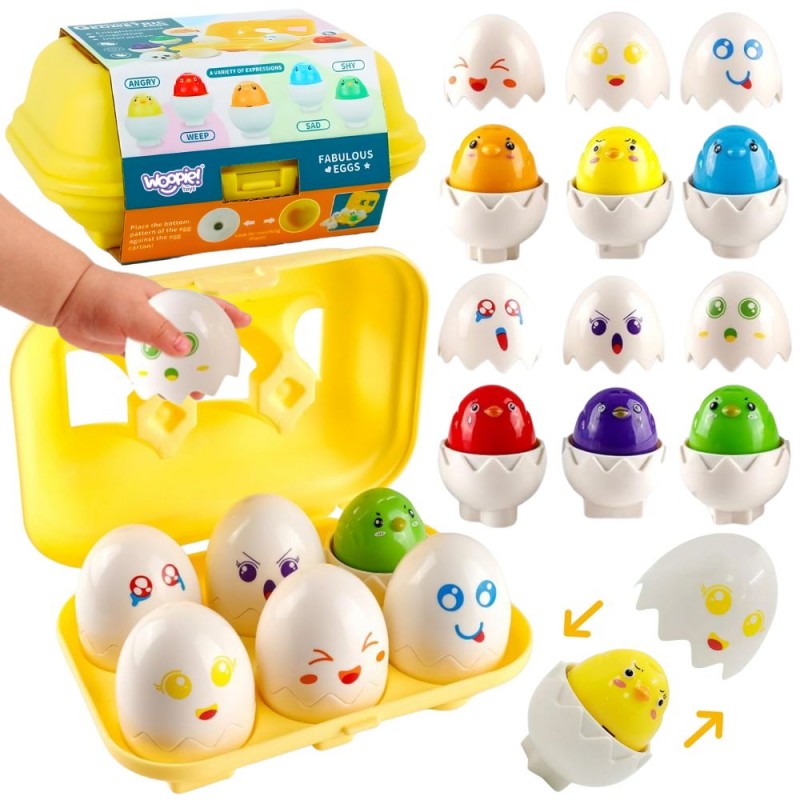 Białe jajka edukacyjne z kolorowymi naklejkami od marki Woopie wprowadzą Twoje dziecko w świat pełen kolorów, kształtów i zabawnych minek. Każde z sześciu uroczych jajeczek skrywa w środku kolorowego pisklaka z inną, śmieszną minką , po naciśnięciu na którego usłyszymy efekt dźwiękowy. Zadaniem malucha jest nie tylko dopasowanie odpowiedniej skorupki do jajka, ale przede wszystkim dopasowanie go do odpowiedniego miejsca w wytłaczance. Każde jajko ma na spodzie unikalny kształt geometryczny, który odpowiada jednemu otworowi w pudełku. Zabawne minki to świetny sposób, aby nauczyć dzieci rozpoznawania i nazywania emocji. Dzięki nim maluchy w łatwy i przyjemny sposób przyswajają, jak wyglądają i co oznaczają różne uczucia.To fantastyczny trening logicznego myślenia i koordynacji!