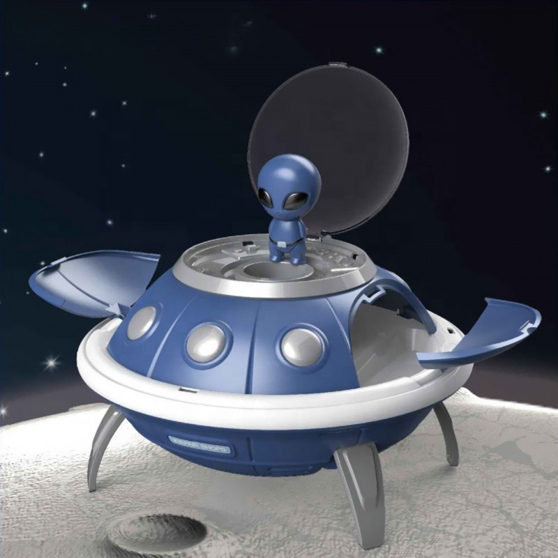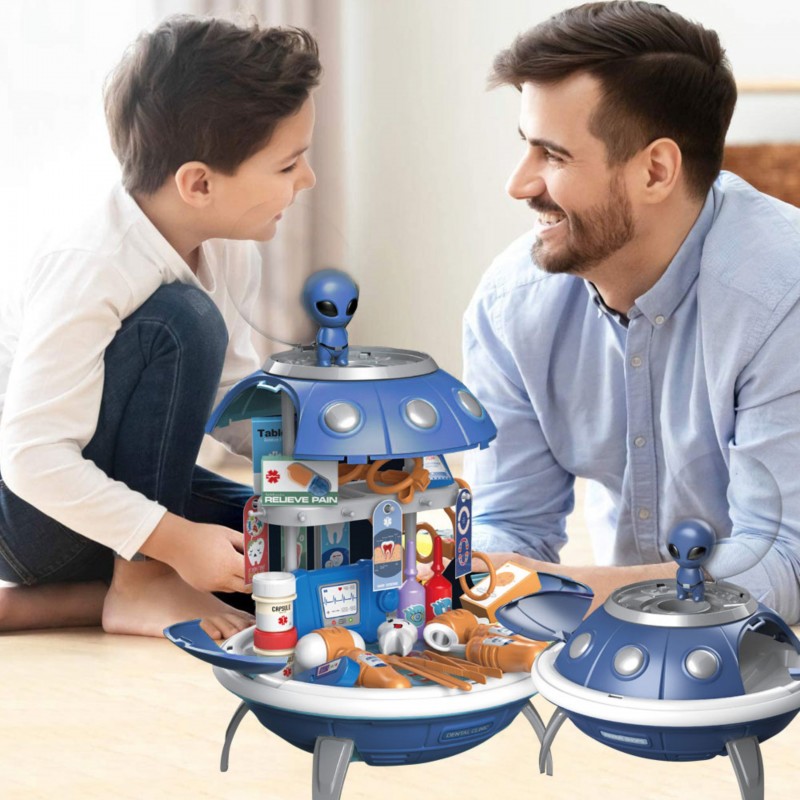 Warsztat UFO od marki WOOPIE to kosmiczny zestaw dla każdego dziecka! Zabawka posiada 3 funkcję. Można włączyć projektor i uczyć się nazw planet. Można użyć go jako stylowy plecak z marsjaninem. Podczas noszenia plecaka głowa marsjanina swobodnie porusza się za szybką statku. Jednak najważniejsza funkcją jest możliwość rozłożenia statku kosmicznego w super warsztat. Dziecko może wcielić się w majsterkowicza na marsie i bawić się wspólnie z przyjaciółmi. Zestaw zawiera aż 52 el.: wszystkie potrzebne rzeczy, które posiada każdy warsztat. Małego kosmitę można złożyć. Funkcja plecaka pozwoli zabrać wszędzie swoją własną przenośną restauracje. Odgrywanie ról i naśladowanie zawodów rozwija świadomość Twojego dziecka oraz pobudza wyobraźnie i kreatywność.