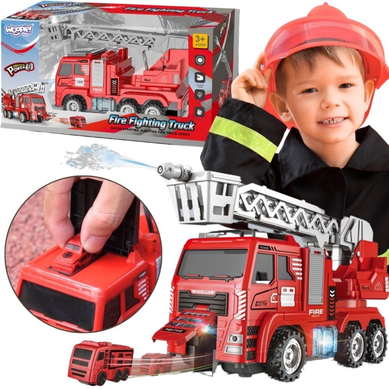 Samojeżdżący wóz strażacki to doskonała zabawka, która pozwoli każdemu małemu miłośnikowi pojazdów ratunkowych poczuć się jak prawdziwy bohater. Zabawka została zaprojektowana z dbałością o najmniejsze detale, które wiernie odwzorowują prawdziwy pojazd strażacki. Model wyposażony jest w wysuwającą się drabinę, oraz armatkę wodną. Po włączeniu pojazd zaczyna jeździć po podłodze wymachując drabiną z armatką wodną na boki, okazjonalnie wystrzeliwując z przodu pojazdu mini pojazdy straży pożarnej