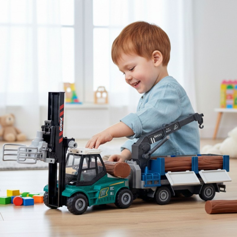 Wózek widłowy z przyczepą do przewozu drewna od marki Woopie to nie tylko ciekawa i realistyczna zabawka, ale także doskonałe narzędzie do wspierania rozwoju dziecka. Model wykonany jest z wysokiej jakości, trwałych materiałów, które gwarantują bezpieczeństwo podczas zabawy oraz długą żywotność produktu. Wózek wyposażony jest w napęd inercyjny, co oznacza, że po pchnięciu sam porusza się do przodu, co dodatkowo uatrakcyjnia zabawę i pobudza dziecięcą wyobraźnię. Wózek widłowy posiada ruchomy chwytak, który pozwala na podnoszenie i przenoszenie drewnianych kłód, co daje dziecku możliwość odgrywania realistycznych scenek związanych z transportem i magazynowaniem. Przyczepa z otwieranymi bokami umożliwia łatwy załadunek i rozładunek belek, co sprzyja rozwijaniu zdolności manualnych oraz koordynacji wzrokowo-ruchowej. Dzięki temu dziecko uczy się logicznego myślenia, planowania kolejnych ruchów oraz precyzji w działaniu. Dodatkowo zabawka została wyposażona w efekty świetlne i dźwiękowe, które symulują prawdziwą pracę maszyny, co jeszcze bardziej angażuje dziecko i stymuluje jego zmysły. Dźwięki pracy silnika, sygnały ostrzegawcze czy odgłosy podnoszenia ładunku sprawiają, że zabawa staje się bardziej realistyczna i emocjonująca. Wszystkie elementy zabawki są starannie zaprojektowane, aby były łatwe w obsłudze nawet dla małych rączek, a zarazem trwałe i odporne na intensywną eksploatację. To świetny wybór dla małych miłośników pojazdów i wszelkich maszyn transportowych.