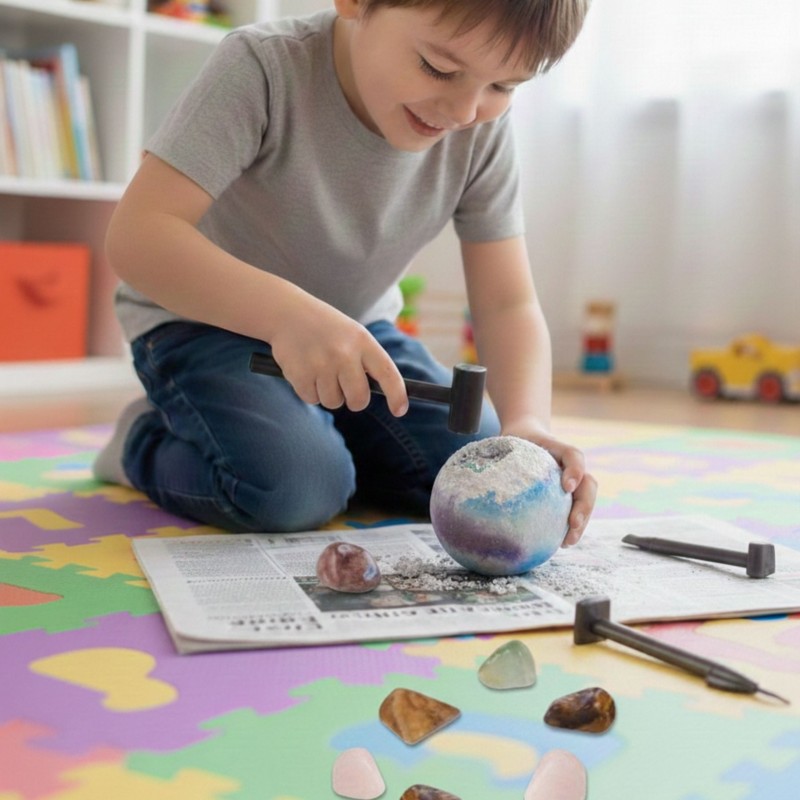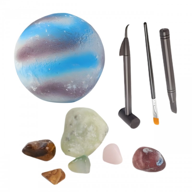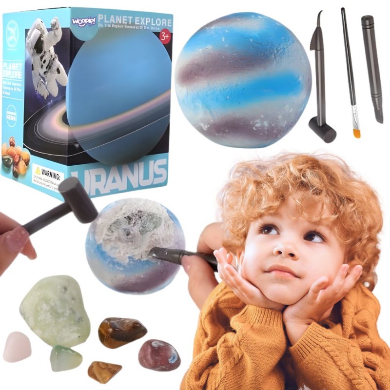Kopalnia kosmicznych minerałów od marki Woopie to niezwykły zestaw edukacyjny, który przeniesie dziecko w fascynujący świat kosmosu i archeologii. Maluch wciela się w rolę odkrywcy, bada ukryte skarby i krok po kroku wydobywa z masy ukryte kamienie oraz kryształy. Zabawa jest ekscytująca i pełna emocji, a przy tym rozwija wiedzę oraz praktyczne umiejętności. To doskonałe połączenie nauki i zabawy, które sprawdzi się zarówno w domu, jak i w grupie rówieśniczej. Zestaw dostarcza realistycznych doświadczeń badawczych – dziecko korzysta z bezpiecznych narzędzi (młoteczek, dłuto, skrobak, pędzelek), aby stopniowo odsłaniać ukryte w bloczku minerały. Każdy kolejny etap to nowe odkrycie i radość z samodzielnego działania. To wciągająca aktywność, która uczy cierpliwości i systematyczności oraz motywuje do dalszych eksperymentów. Zestaw to świetny pomysł na prezent edukacyjny, który pozwala dziecku poznać tajemnice natury i rozwijać zainteresowania przyrodnicze.