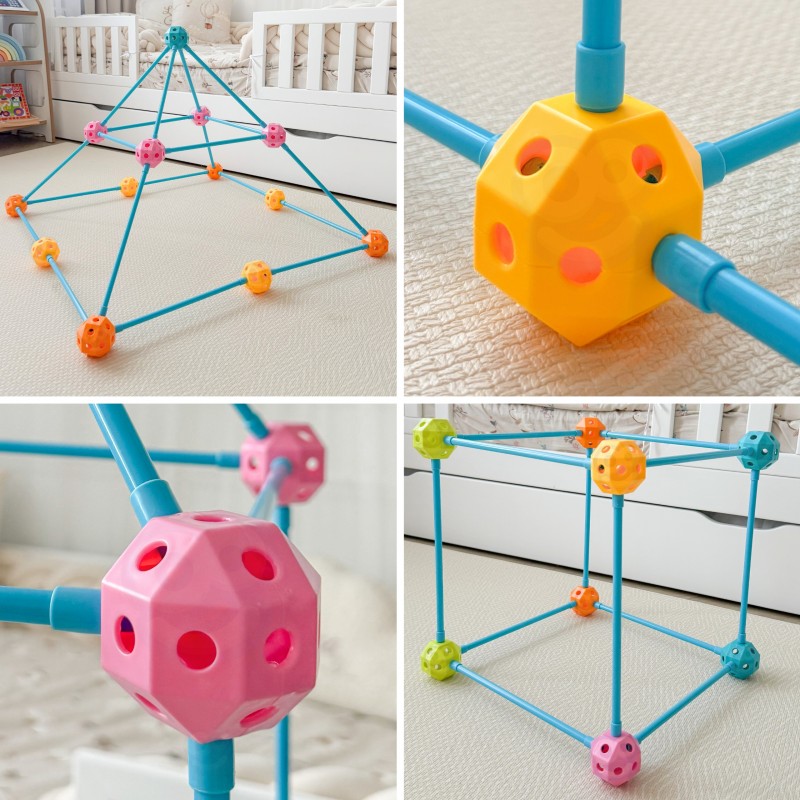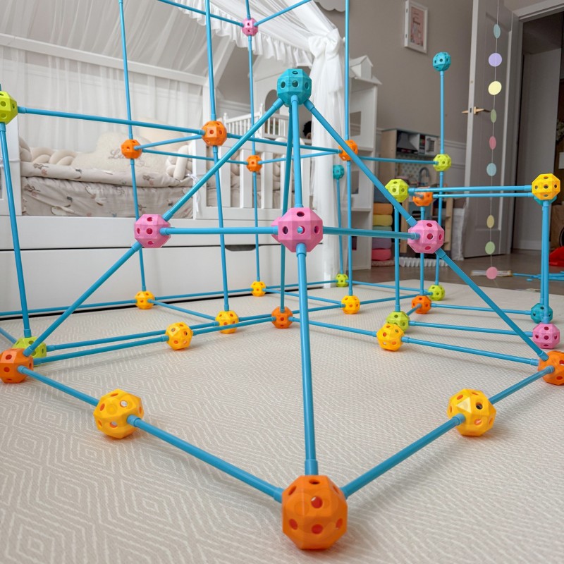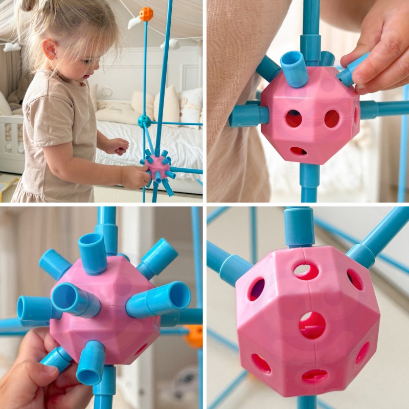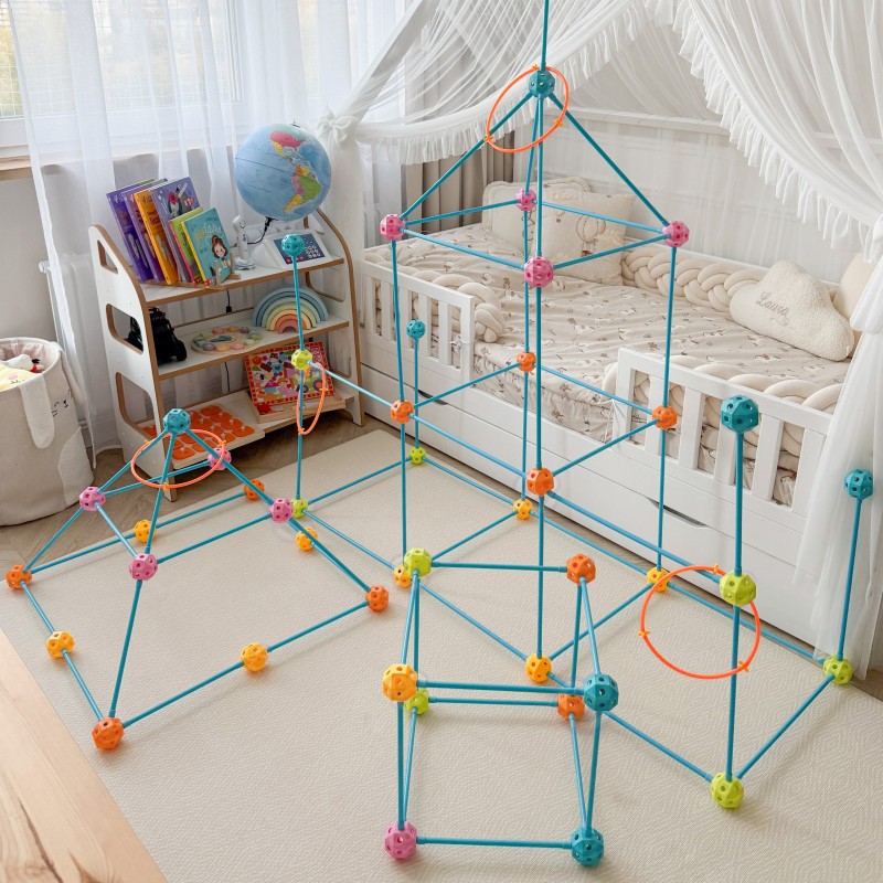 Zestaw konstrukcyjny do budowania od marki Woopie przenosi zabawę w zupełnie nowy wymiar. Dzięki niemu każde dziecko może wcielić się w rolę prawdziwego konstruktora, architekta, tworząc własne bazy, namioty, tunele, wieże czy domki. Zabawa staje się jeszcze ciekawsza, gdy gotową konstrukcję przykryje się kocem, narzutą lub dużym materiałem – wtedy powstaje prawdziwy fort, w którym można się bawić, odpoczywać lub przechowywać swoje skarby. To fantastyczny sposób na spędzanie czasu zarówno samodzielnie, jak i z rodzeństwem czy przyjaciółmi. Zestaw składa się z 340 elementów, w tym lekkich i wytrzymałych patyczków oraz kulistych łączników z otworami, które umożliwiają łączenie elementów pod różnymi kątami (90°, 180°, 45°). Dzięki temu konstrukcje mogą być stabilne, a jednocześnie różnorodne i kreatywne. Dzieci same decydują, czy chcą zbudować wysoką wieżę, przestrzenny domek, bazę kosmiczną czy labirynt – ograniczeniem jest wyłącznie wyobraźnia. Zestaw jest również doskonały wsparciem rozwoju twojego malucha. Dzieci uczą się podstawowych zasad geometrii, rozwijają umiejętności manualne oraz logiczne myślenie. Układanie elementów i planowanie konstrukcji ćwiczy cierpliwość i koncentrację, a wspólna zabawa z rówieśnikami uczy współpracy i komunikacji. To produkt, który idealnie sprawdzi się w domu, na tarasie czy w ogrodzie – wszędzie tam, gdzie dzieci mają ochotę tworzyć swoje własne światy. Rodzice docenią bezpieczeństwo i trwałość zestawu – elementy są lekkie, pozbawione ostrych krawędzi, wykonane z wytrzymałych materiałów, które gwarantują długotrwałe użytkowanie. Dodatkowo cały komplet zapakowany jest w estetyczne pudełko, dzięki czemu łatwo go przechowywać i transportować. To idealny pomysł na prezent urodzinowy, świąteczny lub niespodziankę dla każdego dziecka, które kocha twórcze wyzwania.