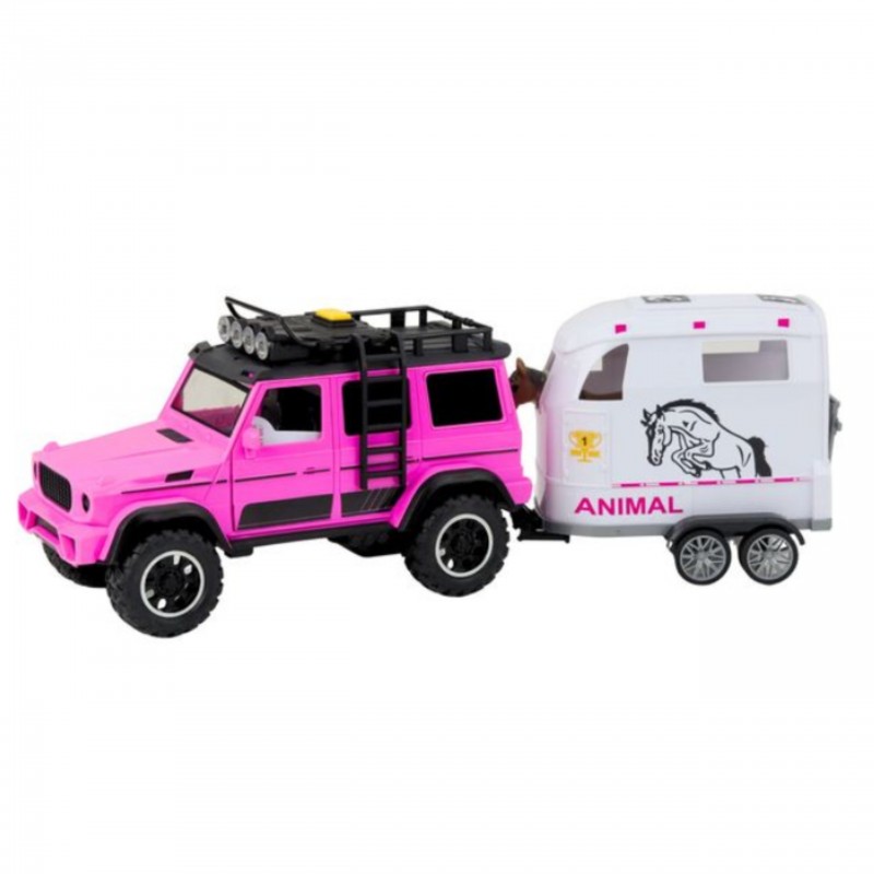 Wzbogać zabawę swojego dziecka o realistyczny zestaw różowego SUVa z białą przyczepa i figurką konia od WOOPIE! - zachwycają detalami i kolorystyką. Samochód wyposażony jest w efekty świetlne i dźwiękowe oraz otwierane drzwi, które zwiększają interaktywność zabawy. Odpinana przyczepa pozwala na zabawę samochodem, przyczepą i koniem osobno, co daje wiele możliwości twórczej zabawy. Idealny prezent dla małych miłośników zwierząt, pojazdów terenowych i kreatywnych zabaw w gospodarstwo. To zestaw, który rozwija wyobraźnię, kreatywność i umiejętności manualne dziecka.