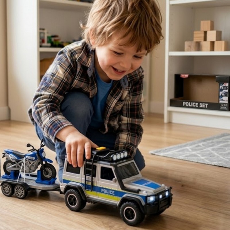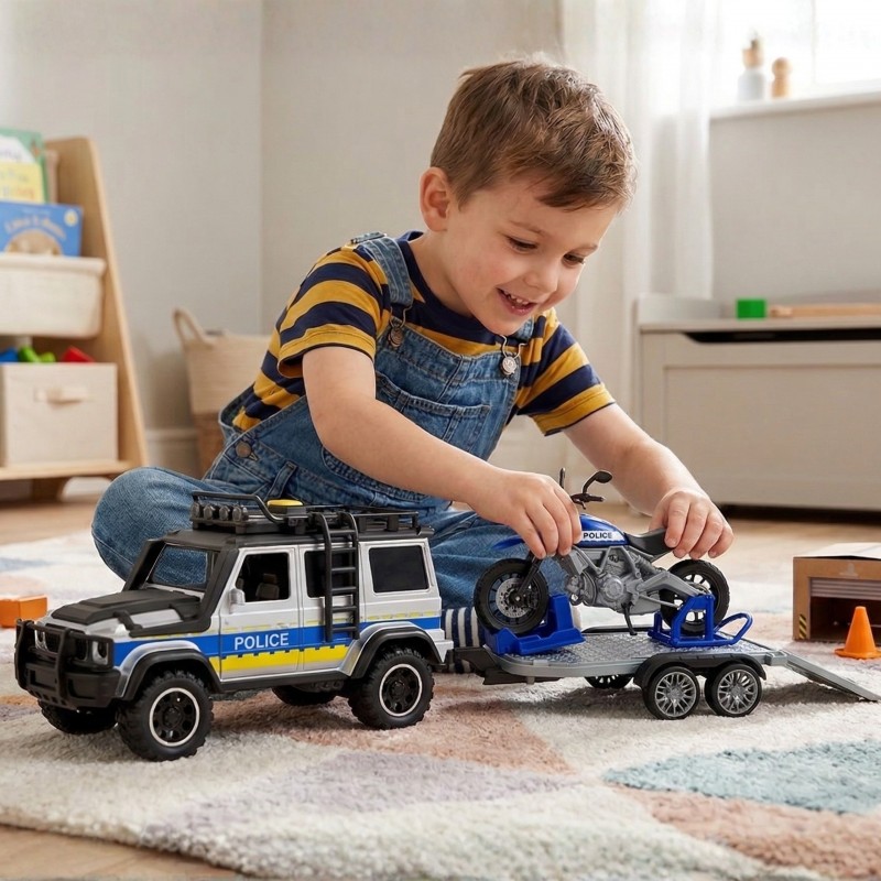 Wzbogać zabawę swojego dziecka o realistyczny zestaw policyjny od marki WOOPIE! Ten dynamiczny zestaw łączy w sobie funkcjonalność i emocjonującą zabawę. W skład zestawu wchodzi duży SUV z efektem świateł i dźwięków oraz przyczepa z motocyklem policyjnym. Otwierane drzwi w samochodzie oraz ruchomy motocykl zwiększają interaktywność zabawy. Idealny wybór dla małych miłośników służb mundurowych, motoryzacji i kreatywnej zabawy w akcje ratunkowe!