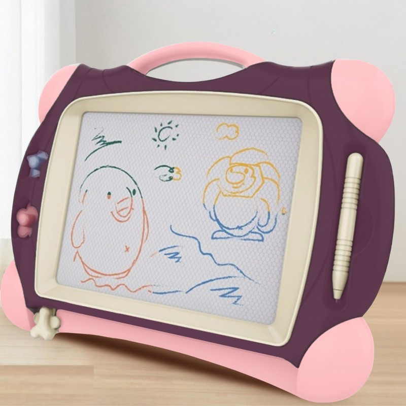 Znikopis Tablica Magnetyczna daje możliwość kreatywnej zabawy na długi czas! Tablica zachęca do pisania i rysowania. Rysowanie pozwoli skoncentrować, wyciszyć i uspokoić Twoje dziecko. Znikopis pozwala na tworzenie nieskończonej ilość obrazków – wystarczy przejechać specjalnym suwakiem, a rysunek zniknie i można rysować od nowa! Zestaw dodatkowo zawiera wygodny magiczny długopis oraz 2 stempelki, które urozmaicą dzieło. Tablica posiada wygodny uchwyt, dzięki czemu dziecko może zabrać ją wszędzie. Znikopis rozwinie u dziecka zdolności manualne, wyobraźnie, kreatywność oraz da szansę na rozwinięcie artystycznej strony dziecka!