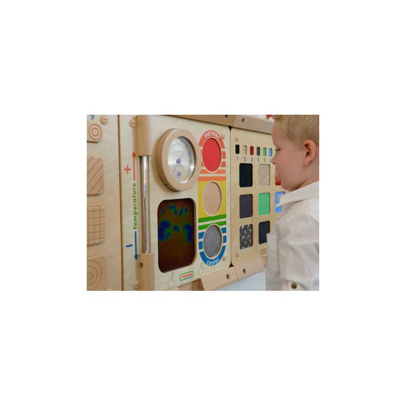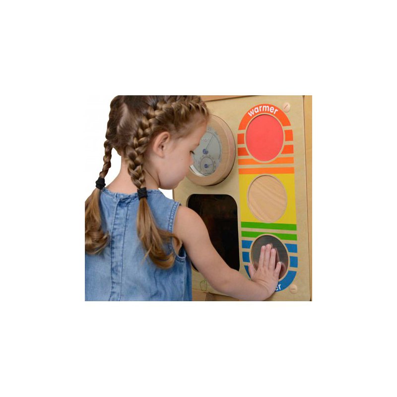 Zabawka wyposażona jest w trzy pola o różnych temperaturach: ciepłe, neutralne i zimne. Dotykając ich, dziecko na własnej skórze doświadcza różnicy. Czarna tablica ciepłoczuła służy do dotykania zimną lub ciepłą rączką. Im dłoń będzie cieplejsza, tym wyraźniejsze i tym bardziej czerwone odciski pozostawi na czarnym materiale.